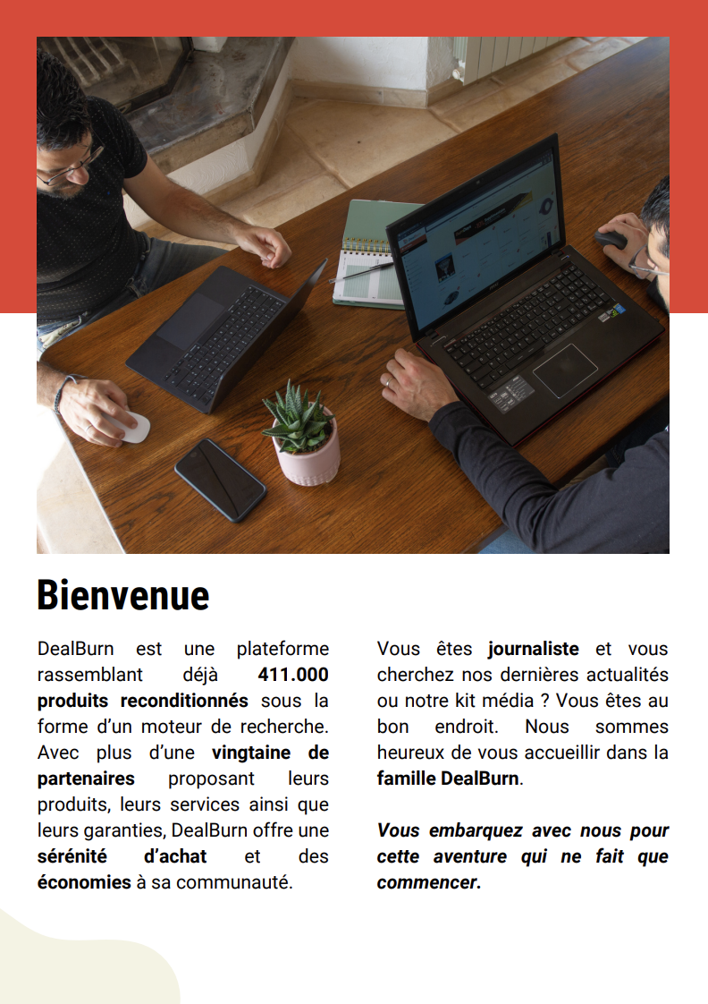 Dealburn est une start-up familiale qui souhaite améliorer l’image du reconditionné. Occasion ne signifie pas nécessairement mauvaise qualité ! En effet, les refus de colis, les erreurs de livraison ou encore les emballages abîmés entraînent un retour à l'expéditeur. À savoir, 95 % des produits reconditionnés sont neufs ! Mais sans le reconditionné, ils auraient fini à la benne. Heureusement, les choses changent. L'article 35 de la loi du 1er janvier 2022 interdit la destruction des produits non- alimentaire. DealBurn fait partie des solutions pour aider la planète et le portefeuille de ses habitants. Son but est de rendre du pouvoir d'achat à sa communauté, sans rogner sur l’écologie.
